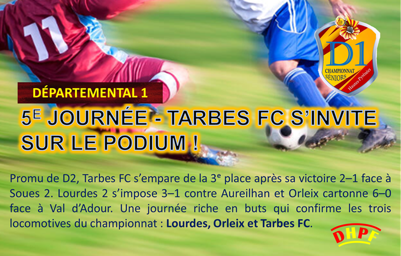 5e journée de D1 : Lourdes solide leader, Orleix invincible, Tarbes FC s'installe sur le podium ! Une journée de combat et de réalisme devant le but, symbole d'un championnat plus disputé que jamais. Une cinquième journée riche en spectacle et en buts : 21 réalisations au total, dont 17 à domicile e...