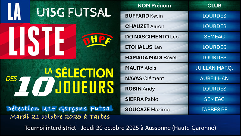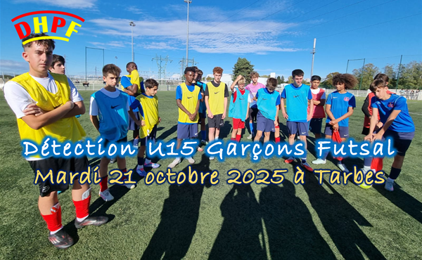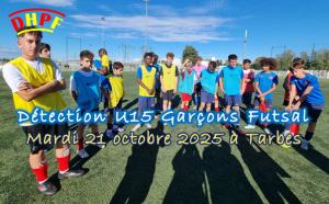 Détection U15 Garçons Futsal – Une journée riche d’apprentissage et de promesses. Le mardi 21 octobre 2025, durant les vacances scolaires, s’est déroulé l’unique tour de détection U15 garçons futsal du District des Hautes-Pyrénées de Football. Cette journée, placée sous le signe du travail, du plais...