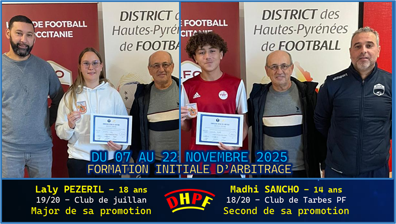 Une mention spéciale a été adressée à Pezeril Laly , âgée seulement de 18 ans et joueuse à Juillan, qui s’est distinguée en obtenant une note exceptionnelle de 19/20 à l’épreuve théorique, faisant d’elle la major de promotion. Elle est suivie de près par le jeune Sancho Madhi, seulement 14 ans mais grand par la taille, représentant le Tarbes Pyrénées Football, qui a décroché une remarquable note de 18/20, se classant ainsi deuxième de cette session. Un grand bravo à eux deux, ainsi qu’à l’ensemble des candidats, pour leur travail et leur sérieux exemplaires.