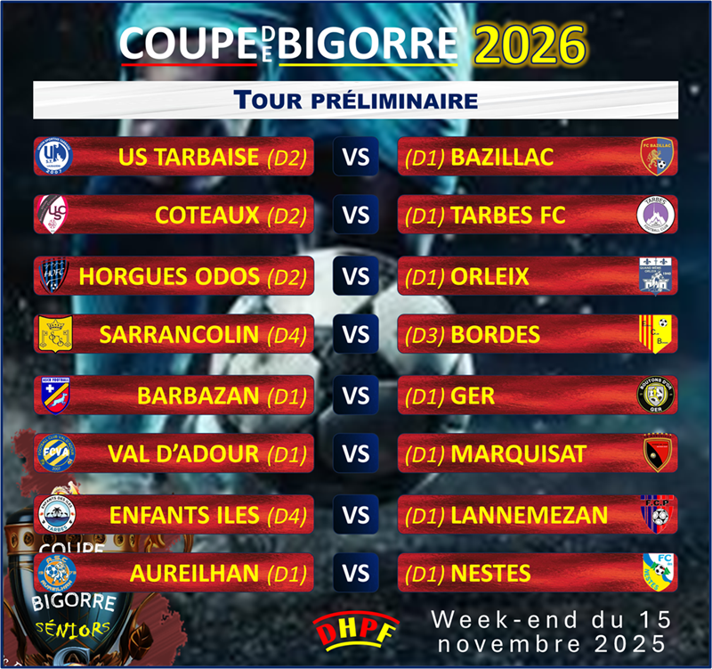 Le tirage au sort du tour préliminaire s’est tenu le samedi 25 octobre 2025 au siège du District des Hautes-Pyrénées. Les équipes de niveau régional sont exemptées de ce premier tour et qualifiées directement pour les huitièmes de finale.