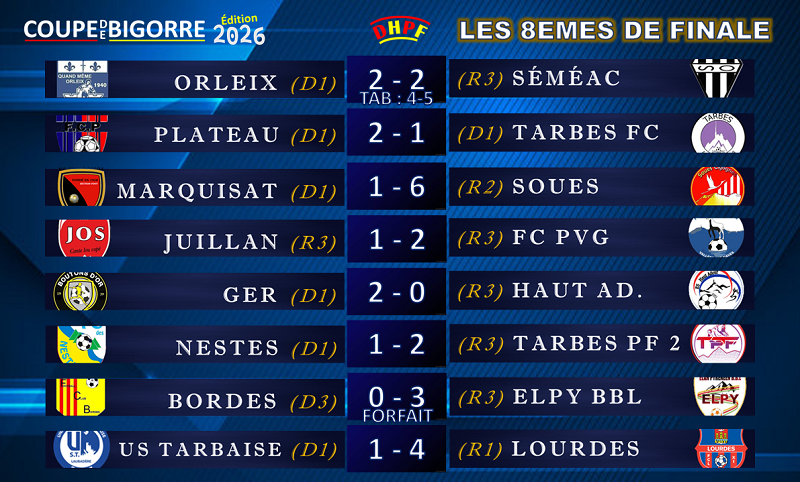 Les huitièmes de finale de la Coupe de Bigorre Maurice Menvielle ont livré leur verdict ce mercredi 8 avril 2026 au soir sur les terrains du département. Entre exploits, confirmations et hiérarchie respectée, le spectacle a été au rendez-vous !