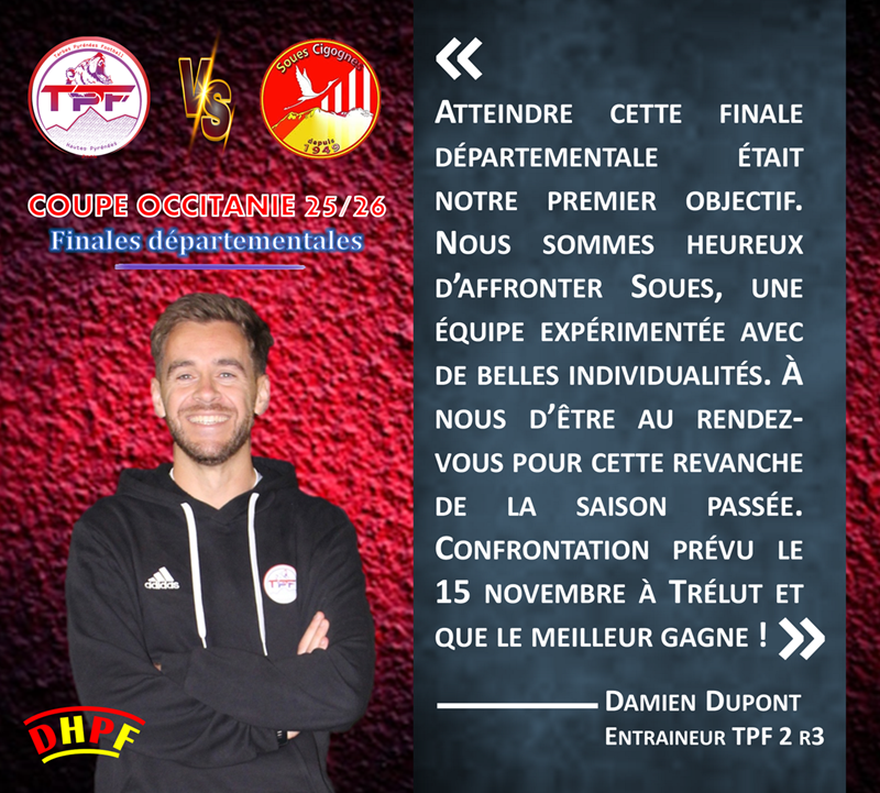 La formation dirigée avec rigueur et expérience aborde cette finale avec la volonté de faire respecter la hiérarchie et de stopper une longue série noire face au TPF. En effet, il faut remonter à 2007 pour trouver la dernière victoire de Soues (2-1) face à une équipe tarbaise (TPF 3), alors que le club évoluait encore en Excellence (l’actuel D1). Depuis, les confrontations ont toujours tourné en faveur du TPF (toutes équipes confondues).
