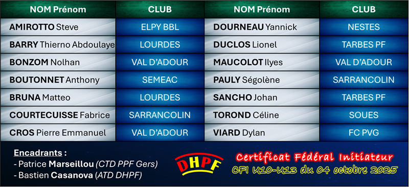 Le District des Hautes-Pyrénées tient à remercier la municipalité de Tarbes pour la mise à disposition des installations du site de Valmy, ainsi que les jeunes du TPF pour leur précieuse participation. Un grand merci également aux formateurs, Patrice Marseillou et Bastien Casanova, pour la qualité de leur encadrement et leur disponibilité.