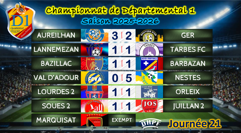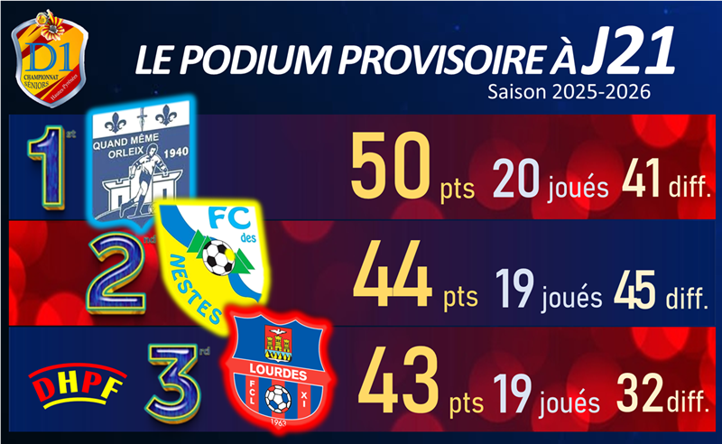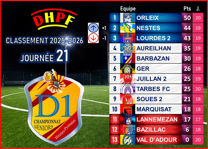La 22e journée pourrait déjà peser très lourd dans la course au titre. Exempt, Orleix laissera une opportunité en or à ses poursuivants de réduire l’écart. Le FC Des Nestes, désormais dauphin, aura un rendez-vous capital face à Aureilhan (4e). En cas de succès, les Nestois reviendraient à seulement trois points du leader avec un nombre de matchs équivalent, relançant encore davantage le suspense.