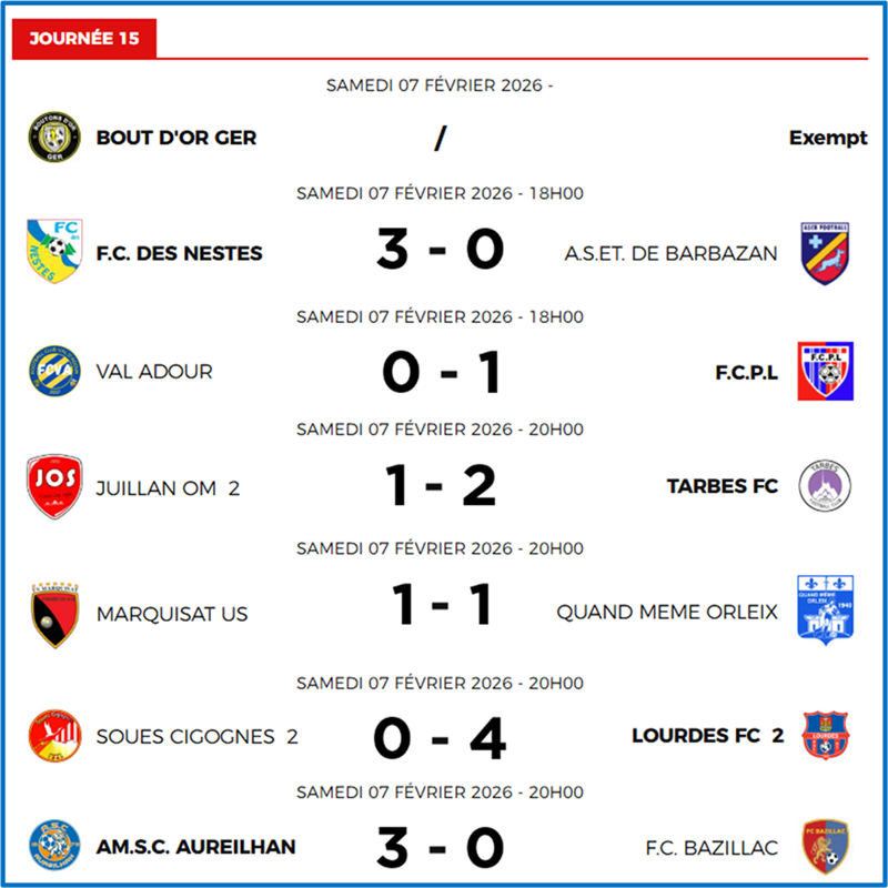 Tarbes FC réalise un joli coup sur la pelouse de Juillan II. Pourtant, ce sont les locaux qui avaient ouvert le score dès la 10e minute et menaient encore à la pause. En seconde période, Tarbes a renversé la situation en deux minutes décisives, inscrivant deux buts rapprochés à la 55e minute pour s’imposer. Un résultat inverse du match aller (J3), remporté par Juillan (3-2).
