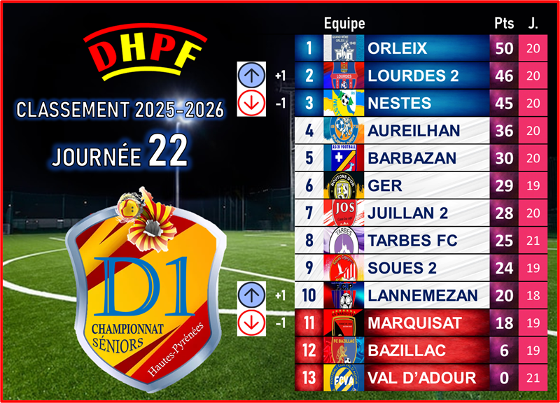 Résultat : Orleix (50 points) conserve une avance confortable, Lourdes FC 2 (46 points) suit, et le FC des Nestes (45 points) recule à la troisième place. Un écart qui n’est pas décisif… mais qui pourrait le devenir.
