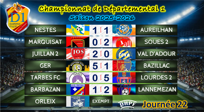 À quatre matches du terme pour le trio de tête, le championnat de Départemental 1 des Hautes-Pyrénées entre dans sa phase la plus palpitante. Fait marquant et assez rare pour être souligné : les trois équipes du podium affichent désormais le même nombre de matchs disputés. Une égalité parfaite qui offre enfin une lecture claire de la course au titre… et qui promet un final irrespirable.
