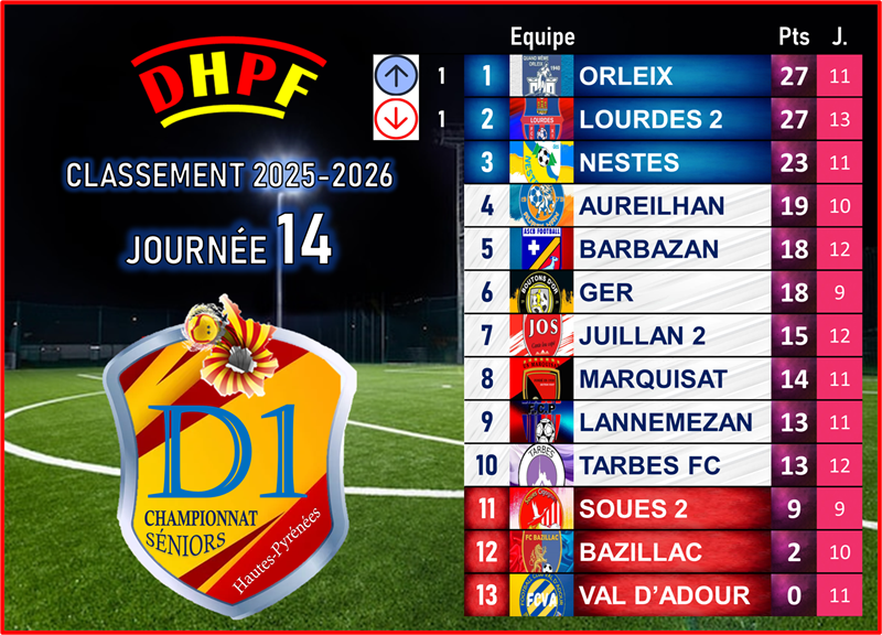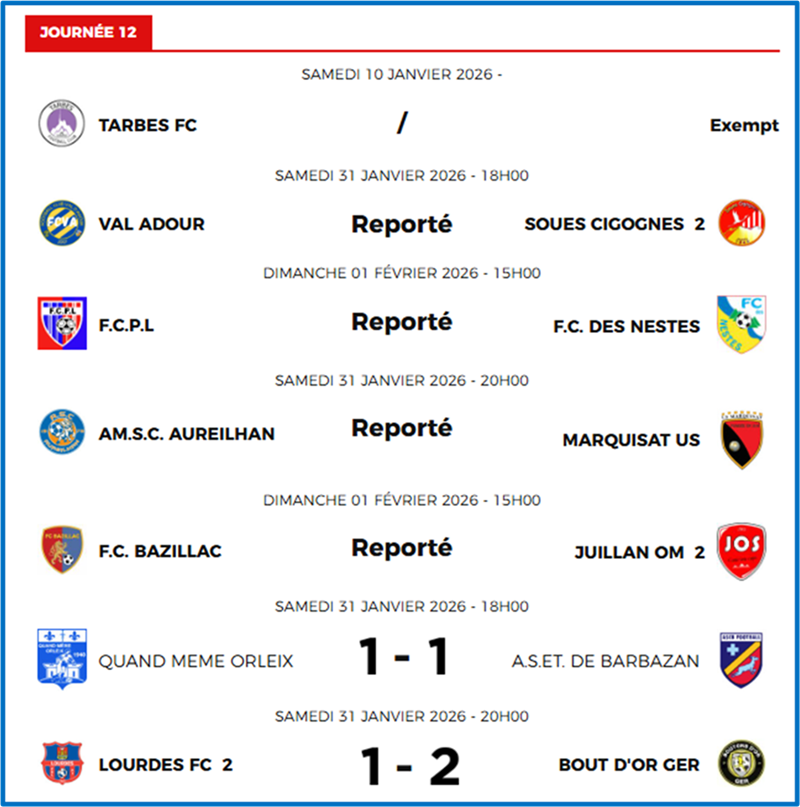 À l’issue de cette J12 en retard, Orleix est leader avec 27 points en 11 matchs, Lourdes II suit avec 27 points en 13 matchs et le FC Des Nestes reste en embuscade avec 23 points en 11 matchs, portée par la meilleure attaque du championnat (38 buts).