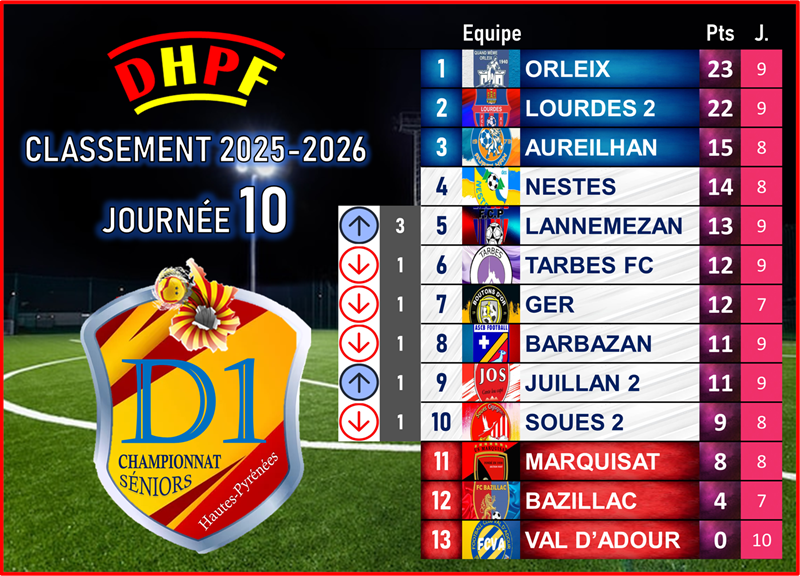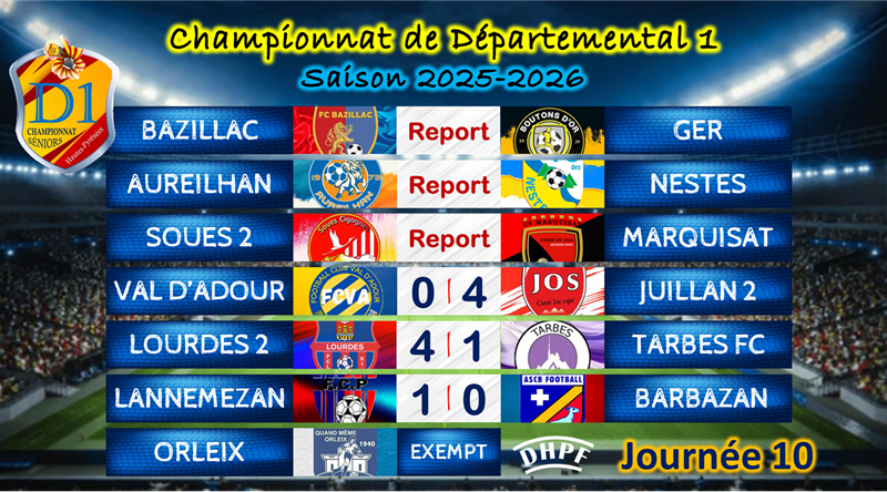 Juillan 2 poursuit sa belle dynamique. Invaincus depuis quatre matchs, les joueurs de la réserve juillanaise font un bond au classement grâce à une victoire nette à l’extérieur. Ils quittent la 10e place pour s’installer neuvièmes (11 pts), tandis que Val d’Adour, toujours en grande difficulté avec 0 point en 10 journées, s’enfonce au classement.