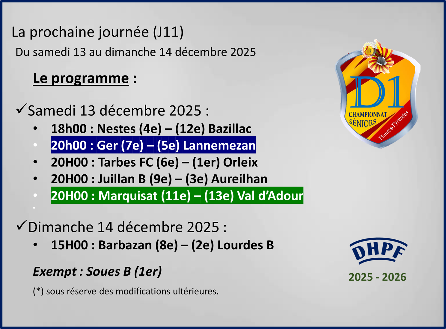 La prochaine journée de Départemental 1, programmée du samedi 13 au dimanche 14 décembre 2025, marquera le dernier rendez-vous avant la trêve hivernale.