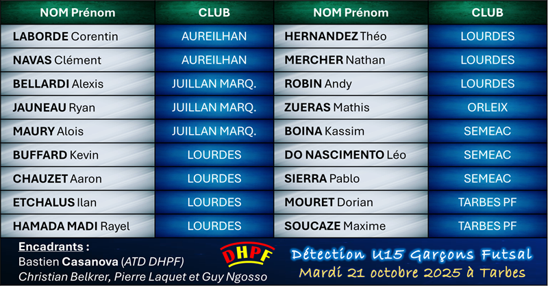 Le mardi 21 octobre 2025, durant les vacances scolaires, s’est déroulé l’unique tour de détection U15 garçons futsal du District des Hautes-Pyrénées de Football.