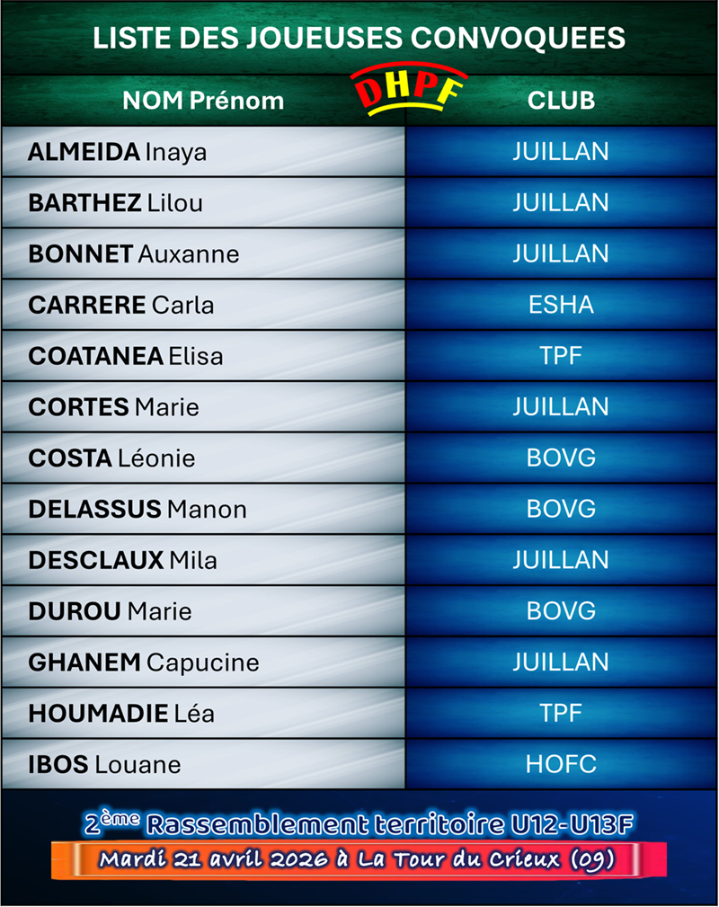 L’encadrement de la sélection était assuré par Christian Belkreir de la Commission Technique et Bastien Casanova, assistant technique départemental du DHPF, dont l’implication a permis d’accompagner au mieux les jeunes joueuses dans leur progression.