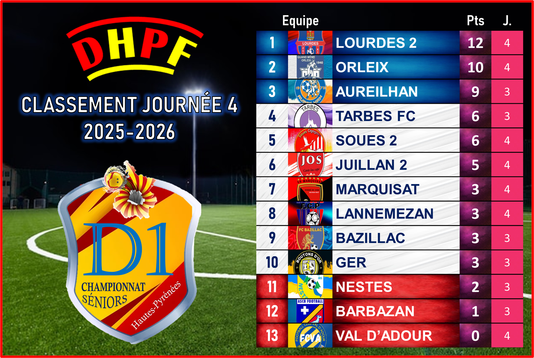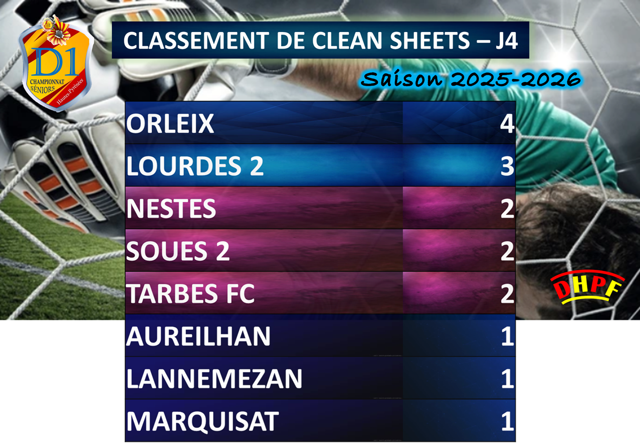 Relégué de Régional 3 à la fin de la saison dernière, Orleix montre qu’il a parfaitement digéré cette descente et qu’il reste armé pour jouer les premiers rôles. Avec quatre matchs joués, aucune défaite, aucun but encaissé et sept buts inscrits, Orleix affiche des statistiques impressionnantes. Il conserve sa place de deuxième avec dix points, à seulement deux longueurs du leader Lourdes 2 et avec Aureilhan en embuscade, un point derrière.