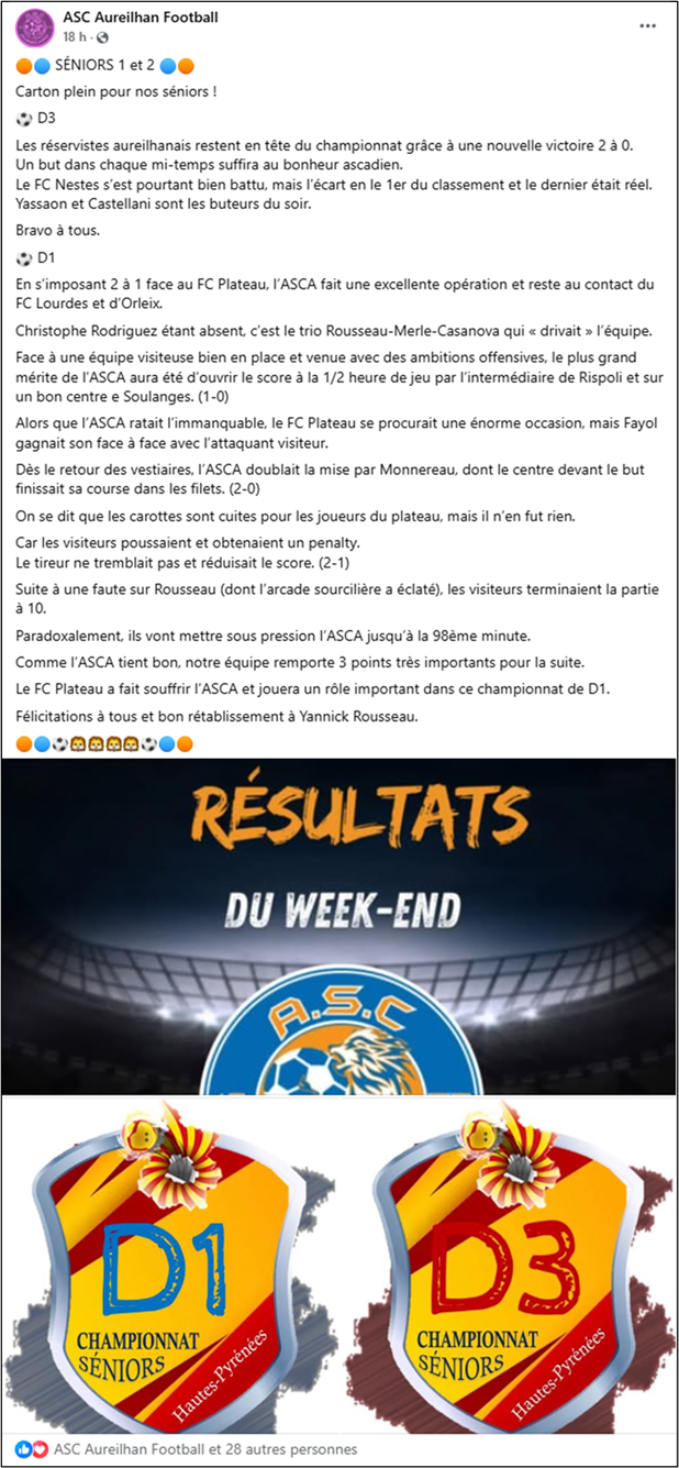 L’autre belle opération du week-end est signée ASCA, vainqueur 2-1 de Lannemezan. Toujours invaincus en trois matchs (9 points), les Aureilhanais conservent leur troisième place et comptent un match de retard.