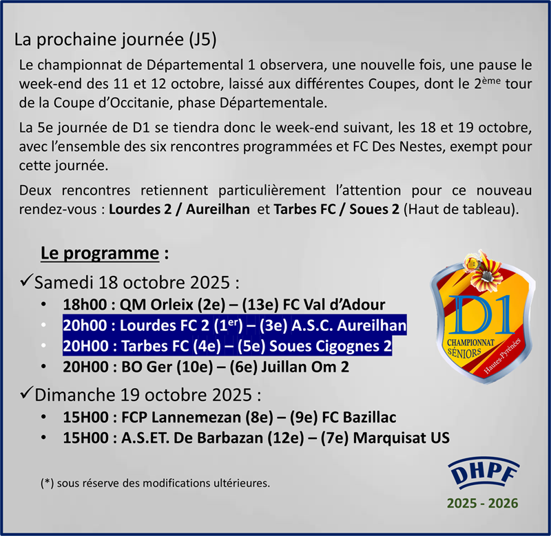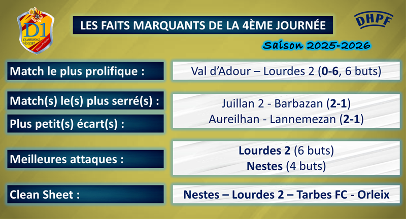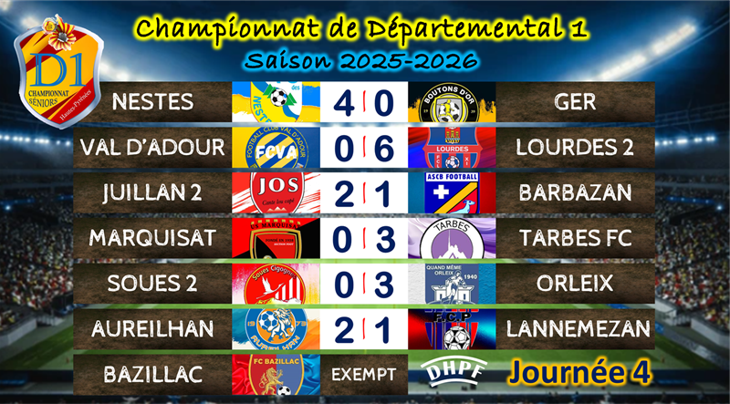 Battus respectivement par Tarbes FC et Nestes, Marquisat et Ger perdent chacun une place. Bazillac, exempté pour cette journée avec un match en moins, descend de deux places et prend le 9e rang et 3 points. Lannemezan, avec sa courte défaite 2-1 contre Aureilhan, stagne à la 8e place (3 points en 4 matches).